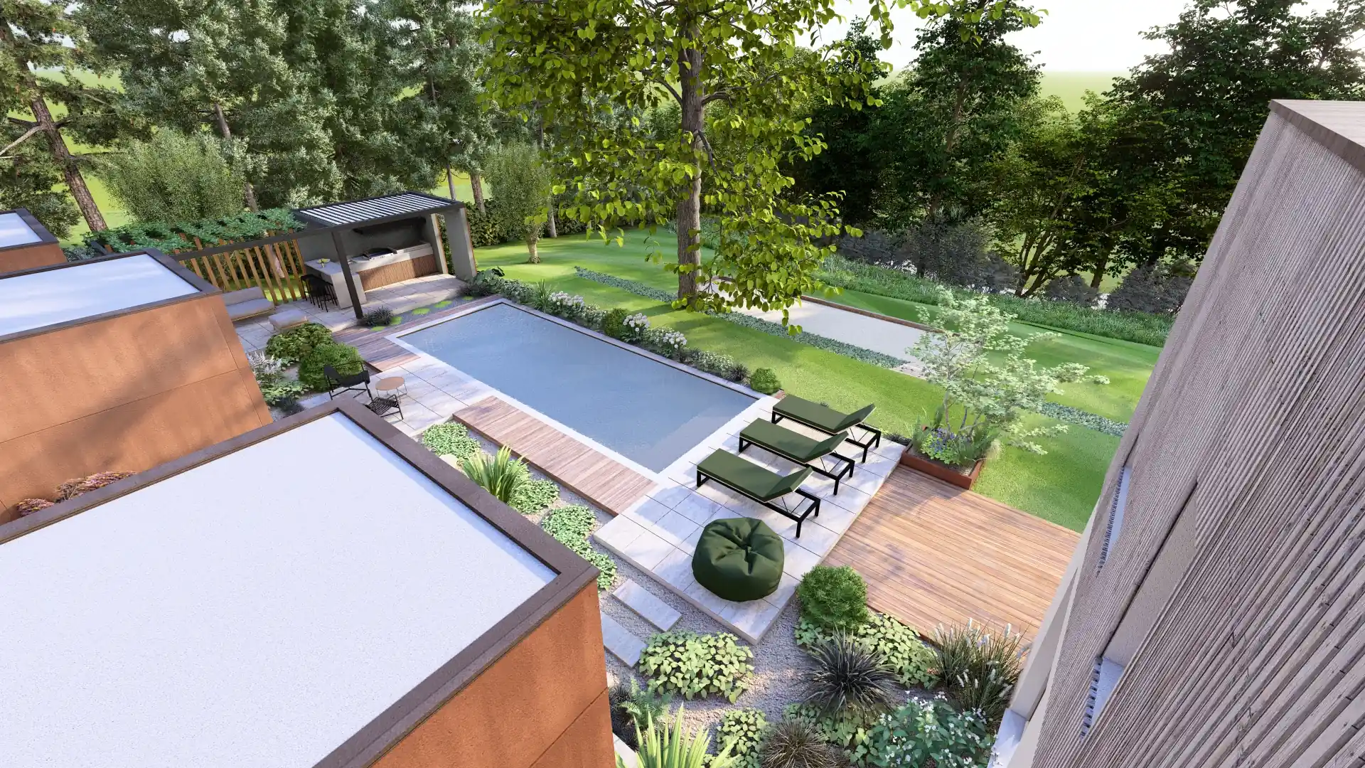L’esquisse met en scène différents espaces paysagers, pensés pour des usages variés.Autour de la maison, le jardin prend une dimension ornementale, articulant avec subtilité cheminements, massifs, terrasses et piscine.