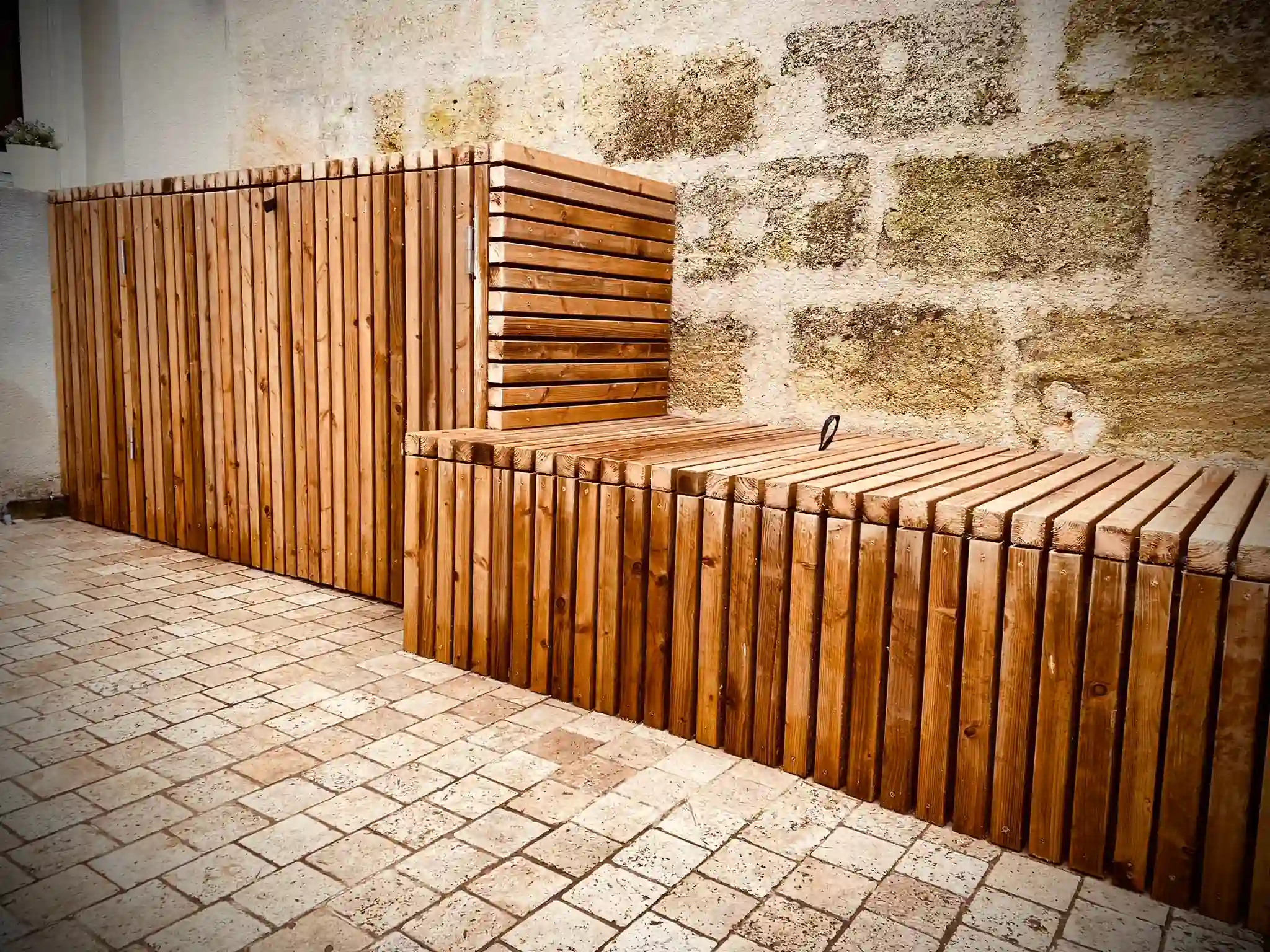 Du mobilier sur mesure en bois a été conçu directement sur la terrasse, offrant à la fois un rangement discret pour les poubelles et l’outillage et une banquette escamotable pour les accessoires de piscine. La découpe partielle des bacs en acier corten existants a permis d’ouvrir la perspective depuis la pièce de vie, créant une connexion visuelle directe avec le jardin.