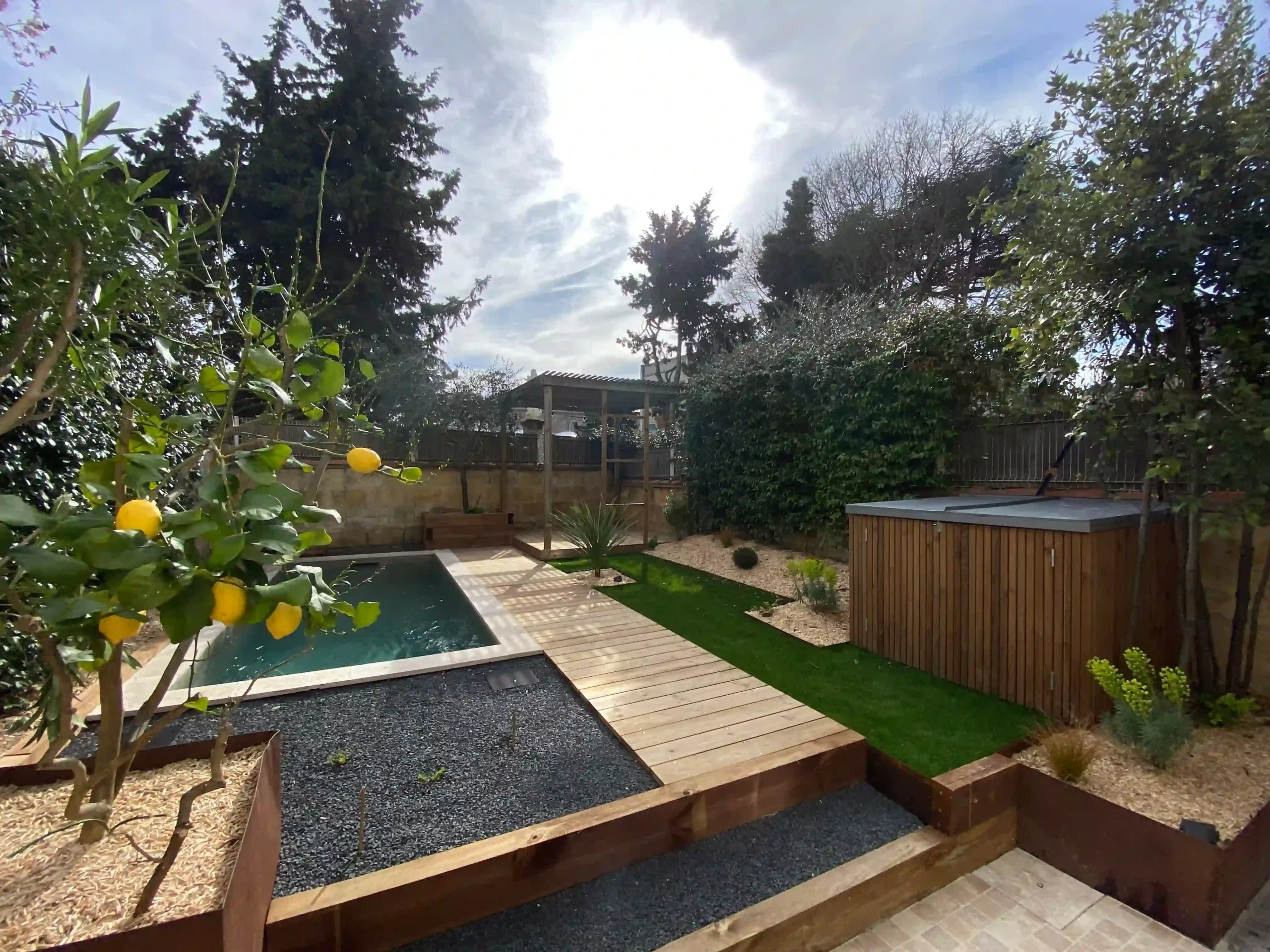 Un long deck en bois renforce l’effet de profondeur et met en valeur l’olivier existant, conservé et intégré dans un bac rehaussé, comme point structurant du jardin.