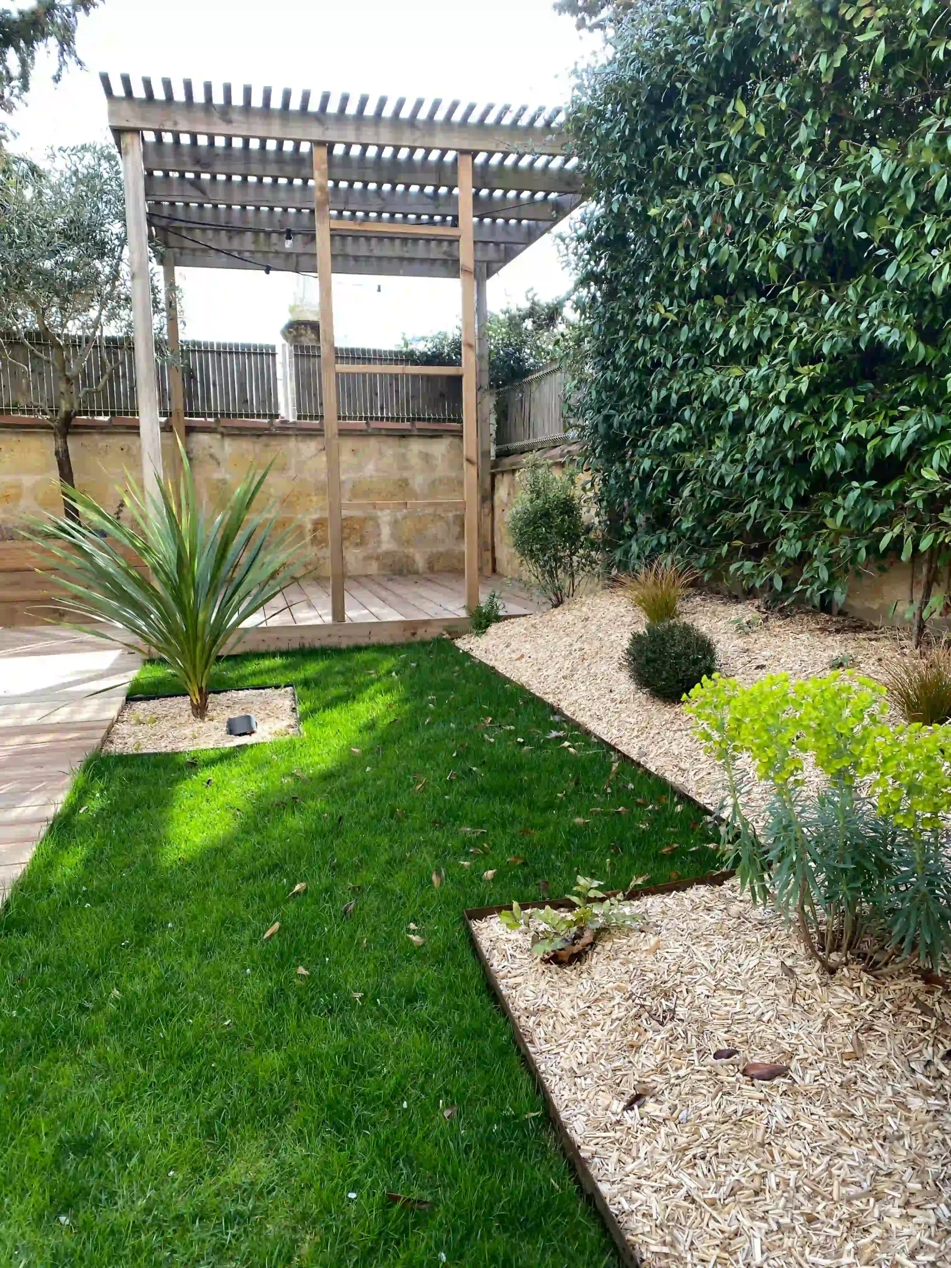 L’ancienne pergola a été repensée pour accueillir un espace détente surélevé au fond de la parcelle, prolongeant ainsi l’usage du jardin tout au long de la journée.