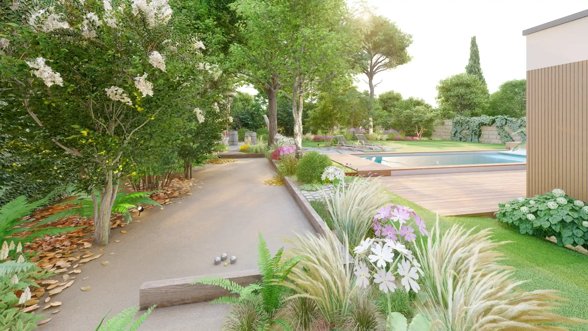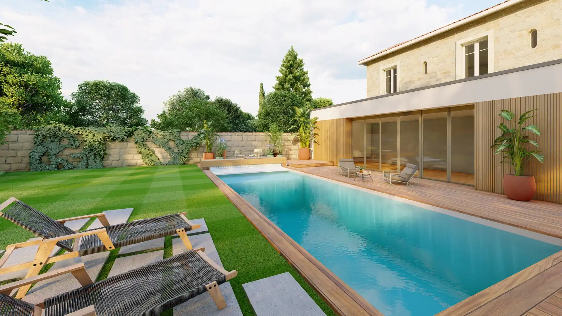 Ce projet d’aménagement extérieur a pour objectif d’accompagner l’agrandissement de la maison et la création d’une nouvelle piscine légèrement surélevée, tout en intégrant un boulodrome de manière élégante et naturelle.
