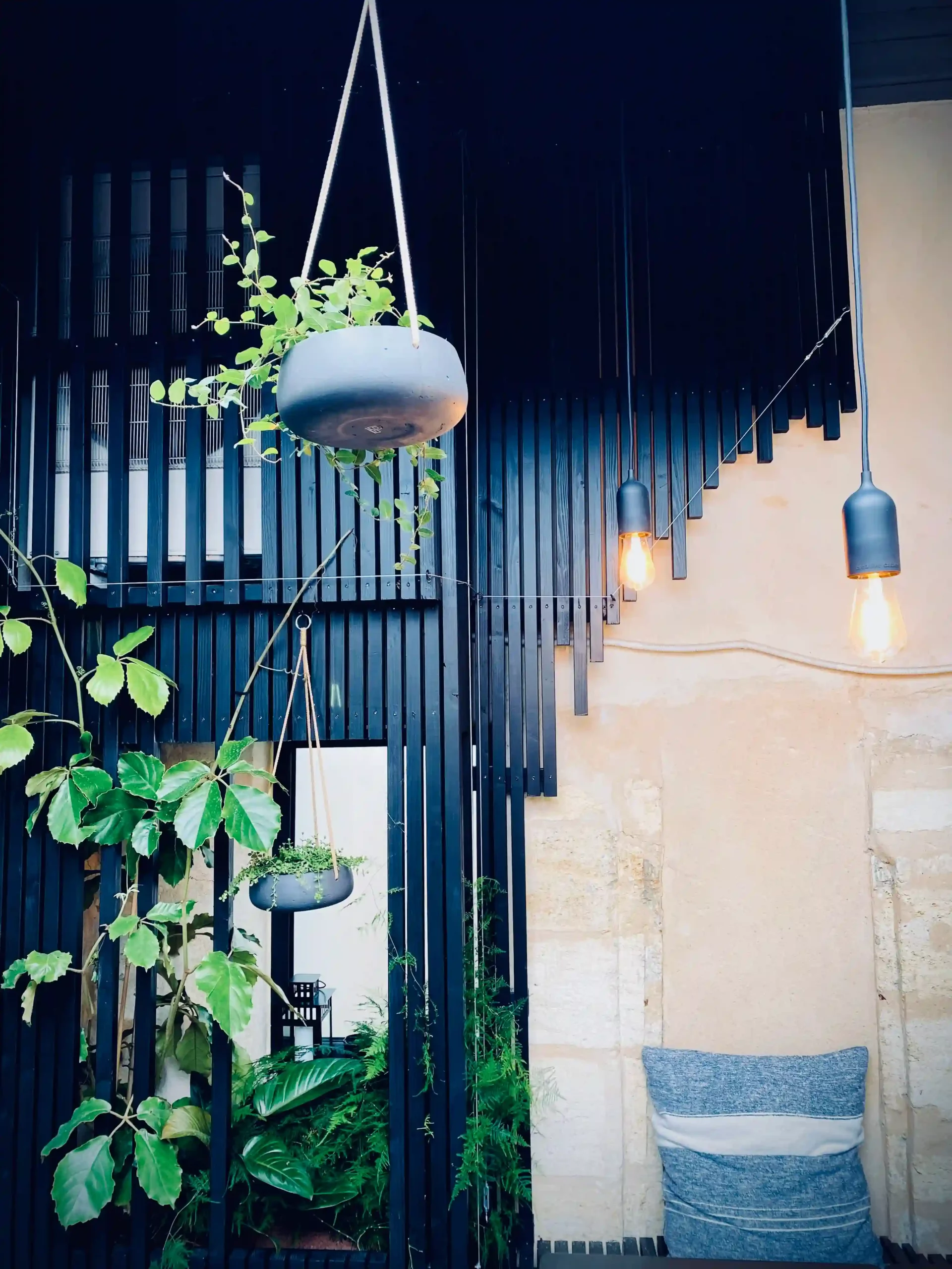 Aménagement de patio | Bardage bois | Végétalisation verticale | Plantes grimpantes | Suspensions végétales | Éclairage d’ambiance | Optimisation de l’espace