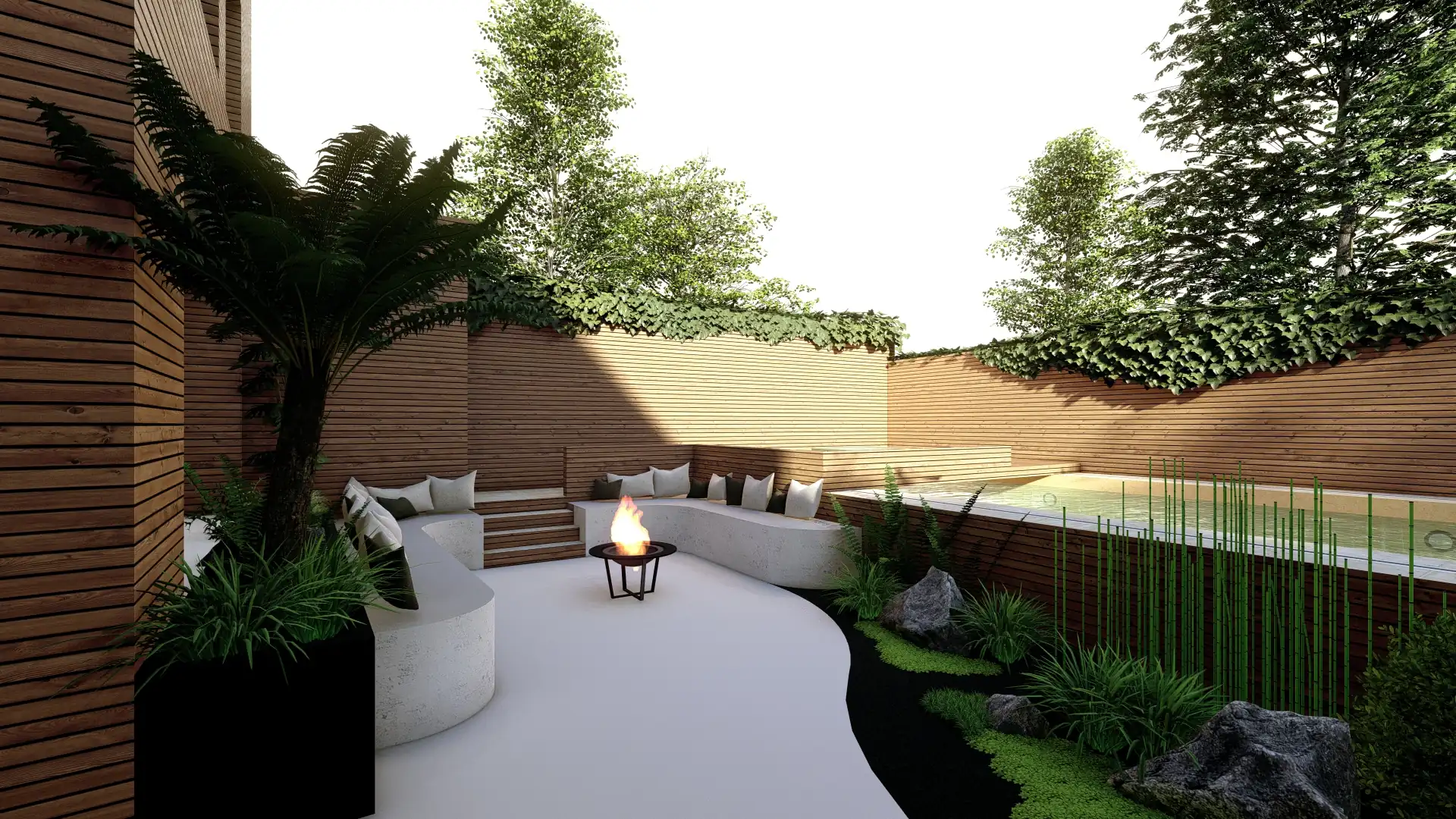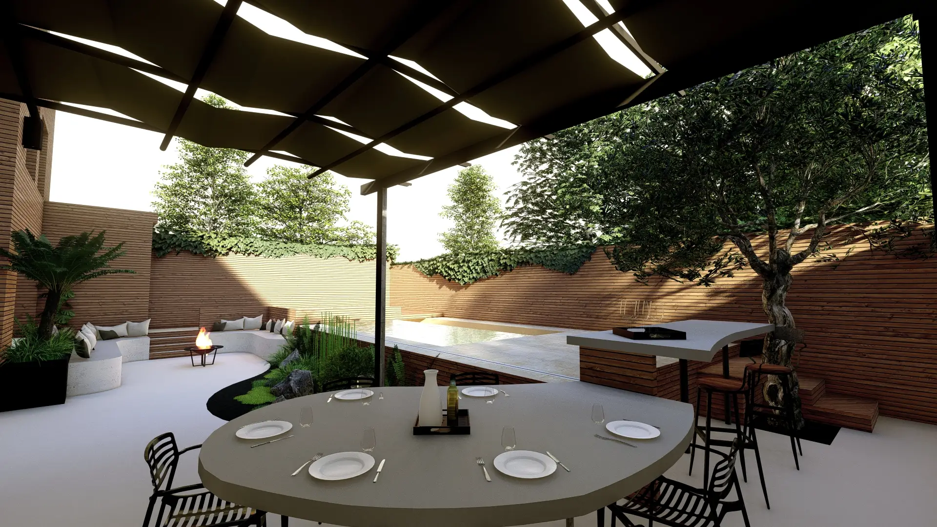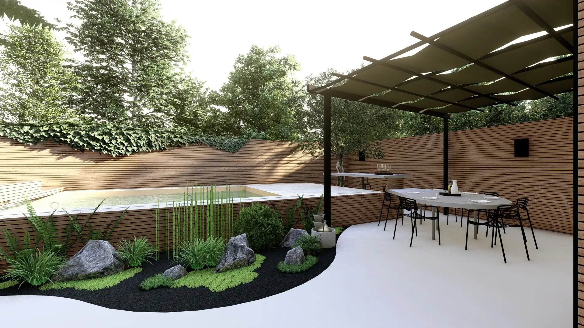 Le végétal tient une place centrale avec la création d’un nouveau massif structuré autour d’une Dicksonia déjà présente sur le site, mise en valeur comme pièce maîtresse. Pour anticiper les étés bordelais, une pergola en métal viendra recevoir un voilage léger afin d’apporter ombrage et confort.