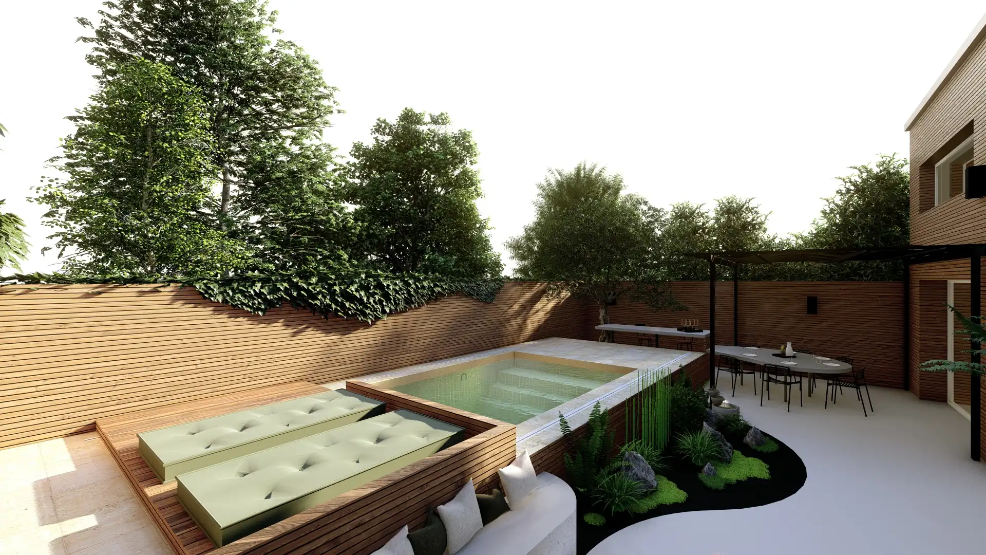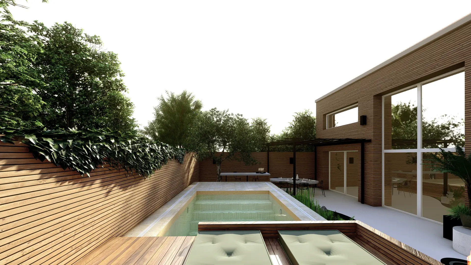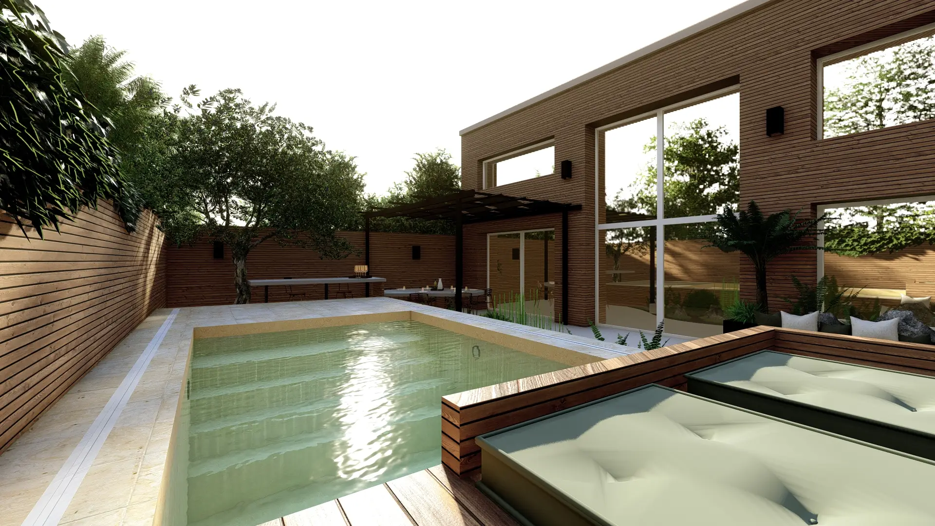 L’aménagement s’organise autour de plusieurs espaces complémentaires : un bassin de baignade accompagné d’une terrasse mobile offre une ambiance rafraîchissante et évolutive.