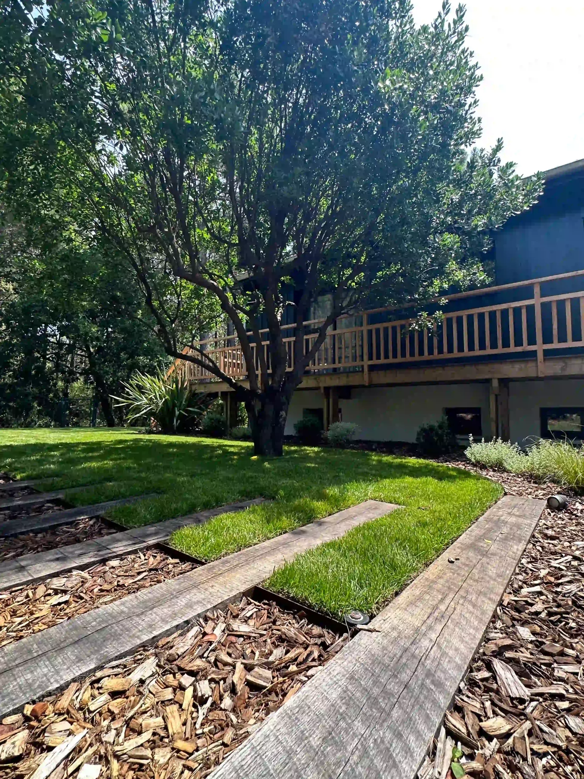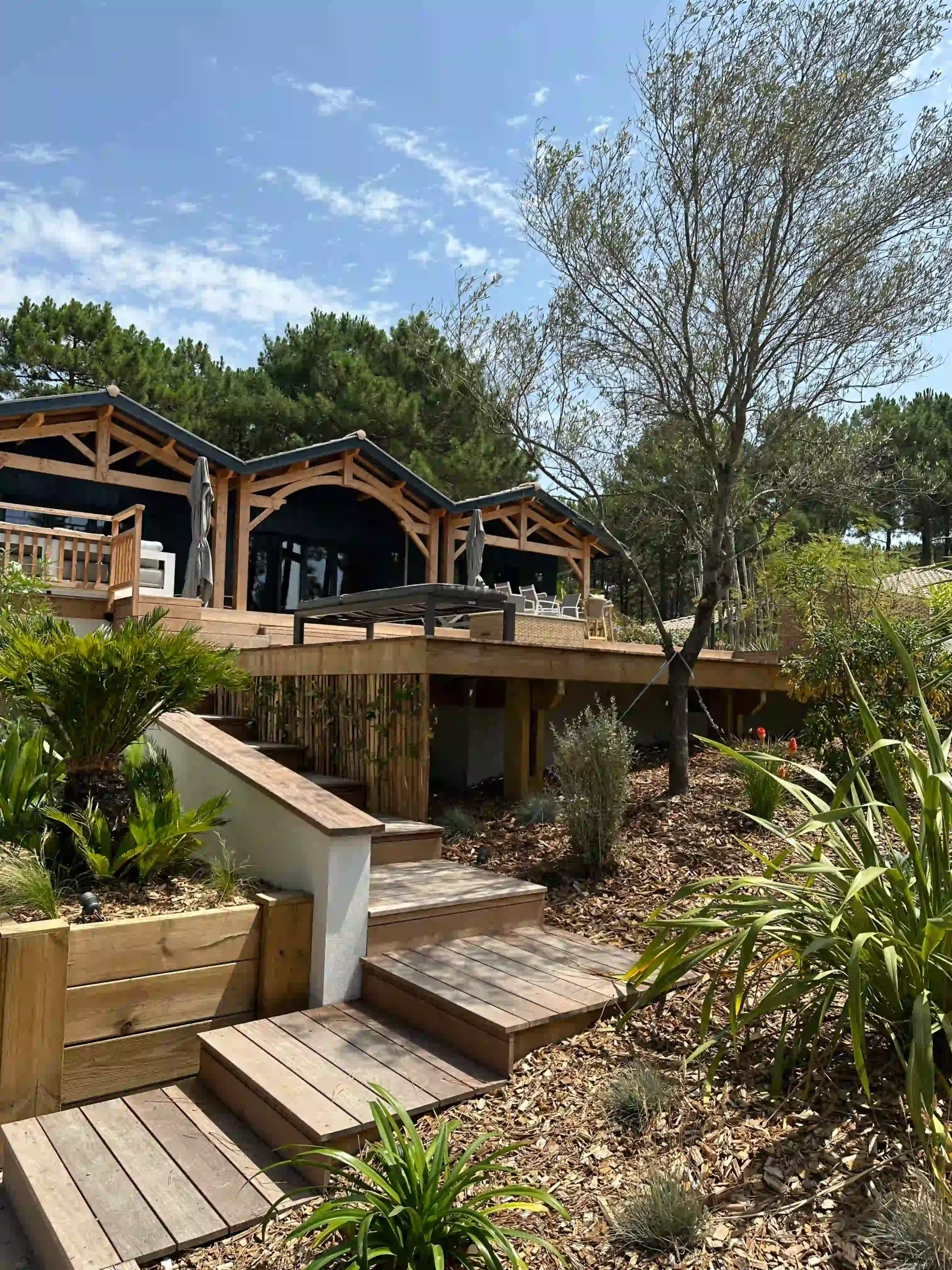 À l’arrière, le jardin devient plus intime et boisé, offrant depuis les chambres une vue apaisante sur le paysage forestier environnant. Cet aménagement favorise la sérénité et la fraîcheur, tout en prolongeant visuellement la forêt de pins.